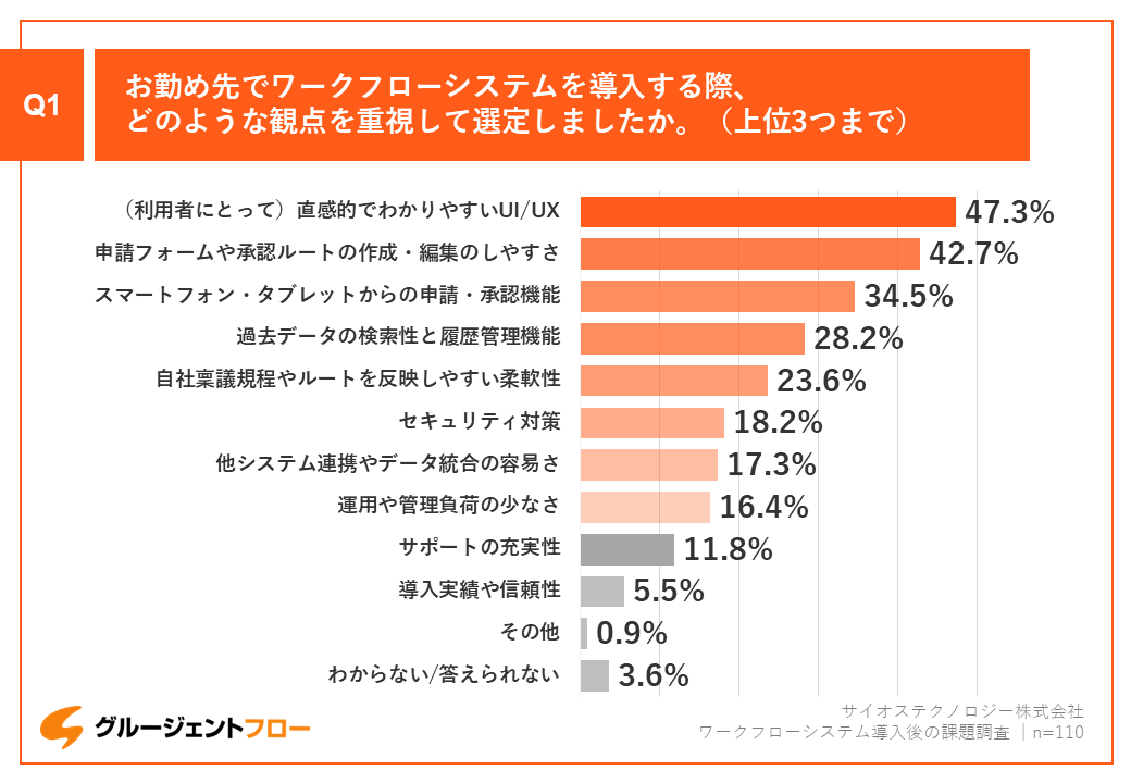 - 約半数が、ワークフローシステム選定時に「(利用者にとって)直感的でわかりやすいUI/UX」を重視