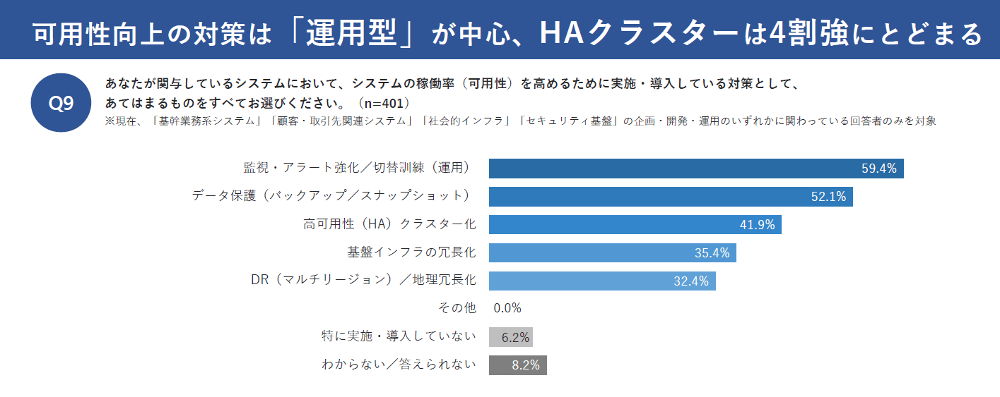 - 可用性向上の対策は「運用型」が中心、HAクラスターは4割強にとどまる