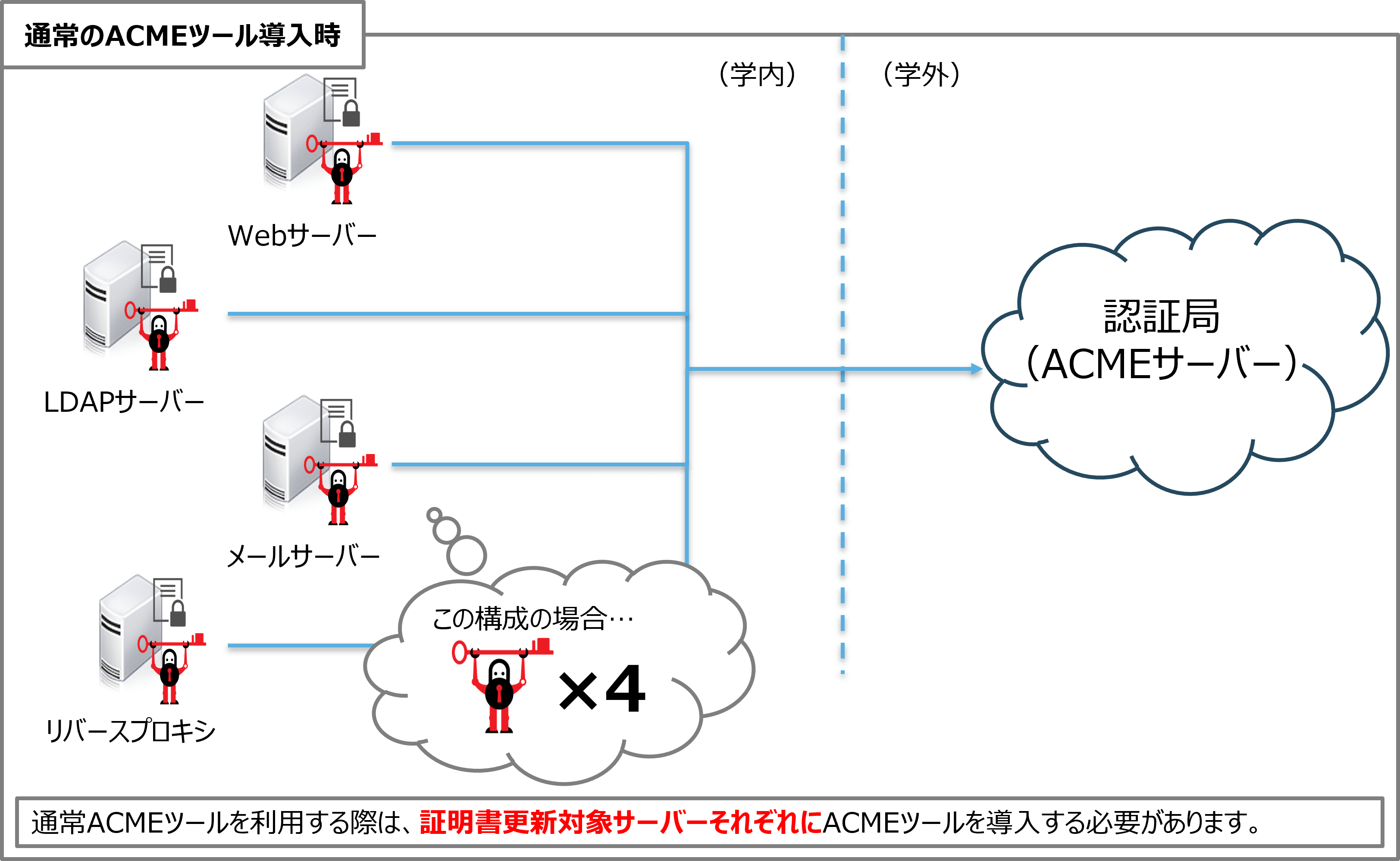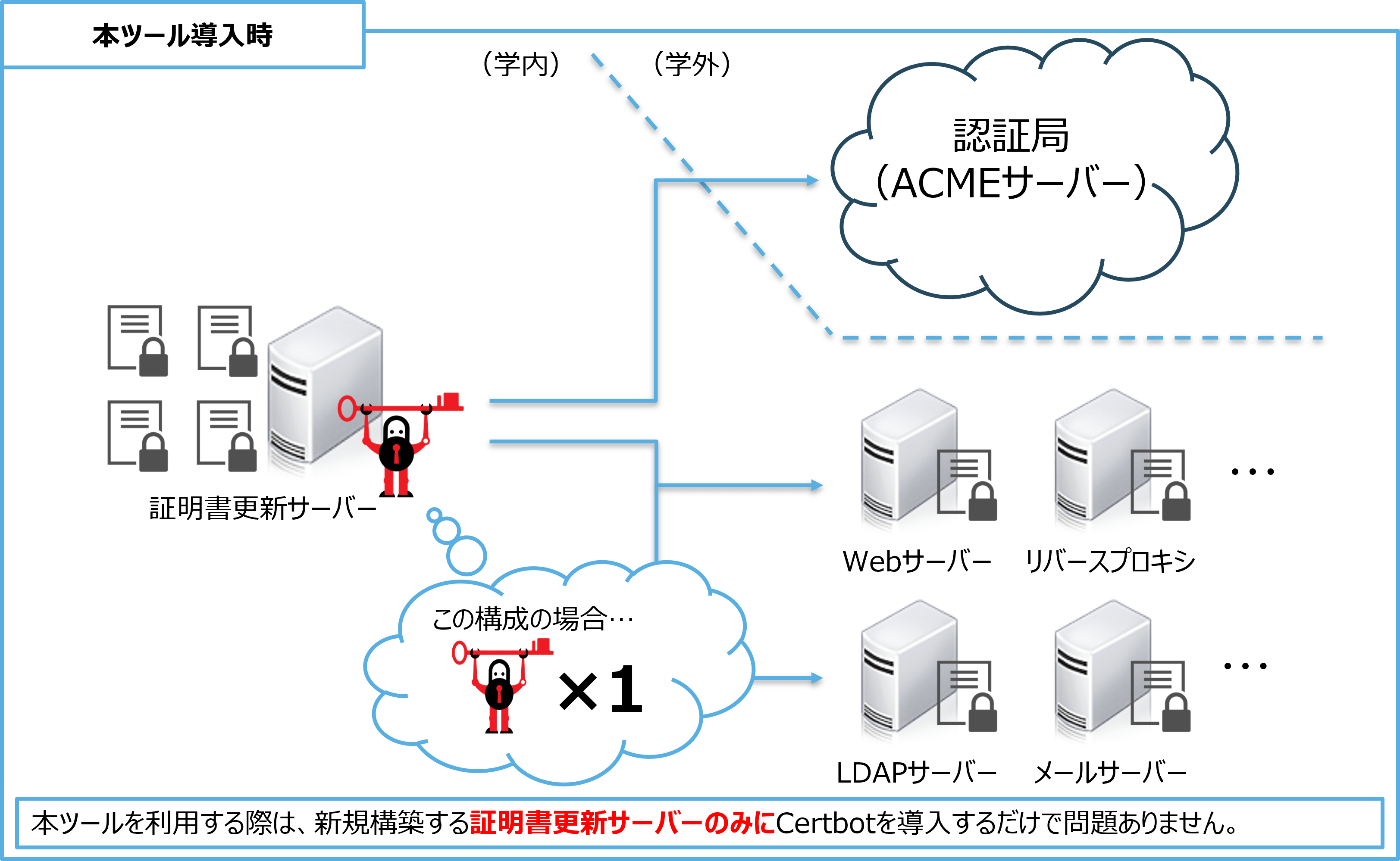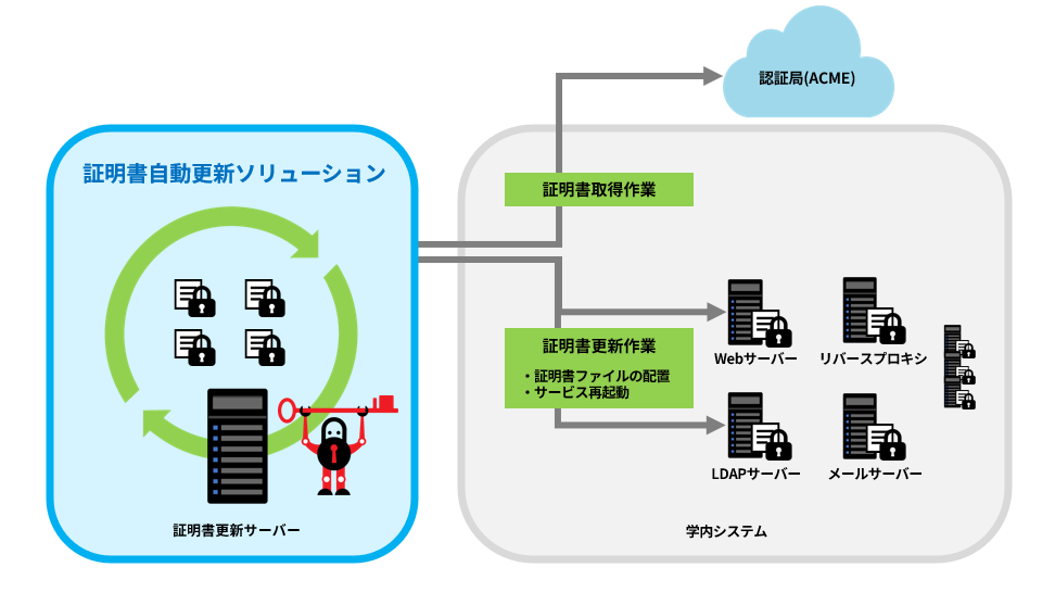 通常の場合ACMEクライアントは基本的に証明書更新対象のサーバー自体に導入しますが、本ソリューションは証明書更新サーバーを1台構築し、当該サーバーでSSLサーバー証明書の取得から証明書更新対象サーバーへの新証明書配置、証明書更新対象サーバー上でのサービスの再起動まで行うことができるため、証明書の一元管理が可能です。