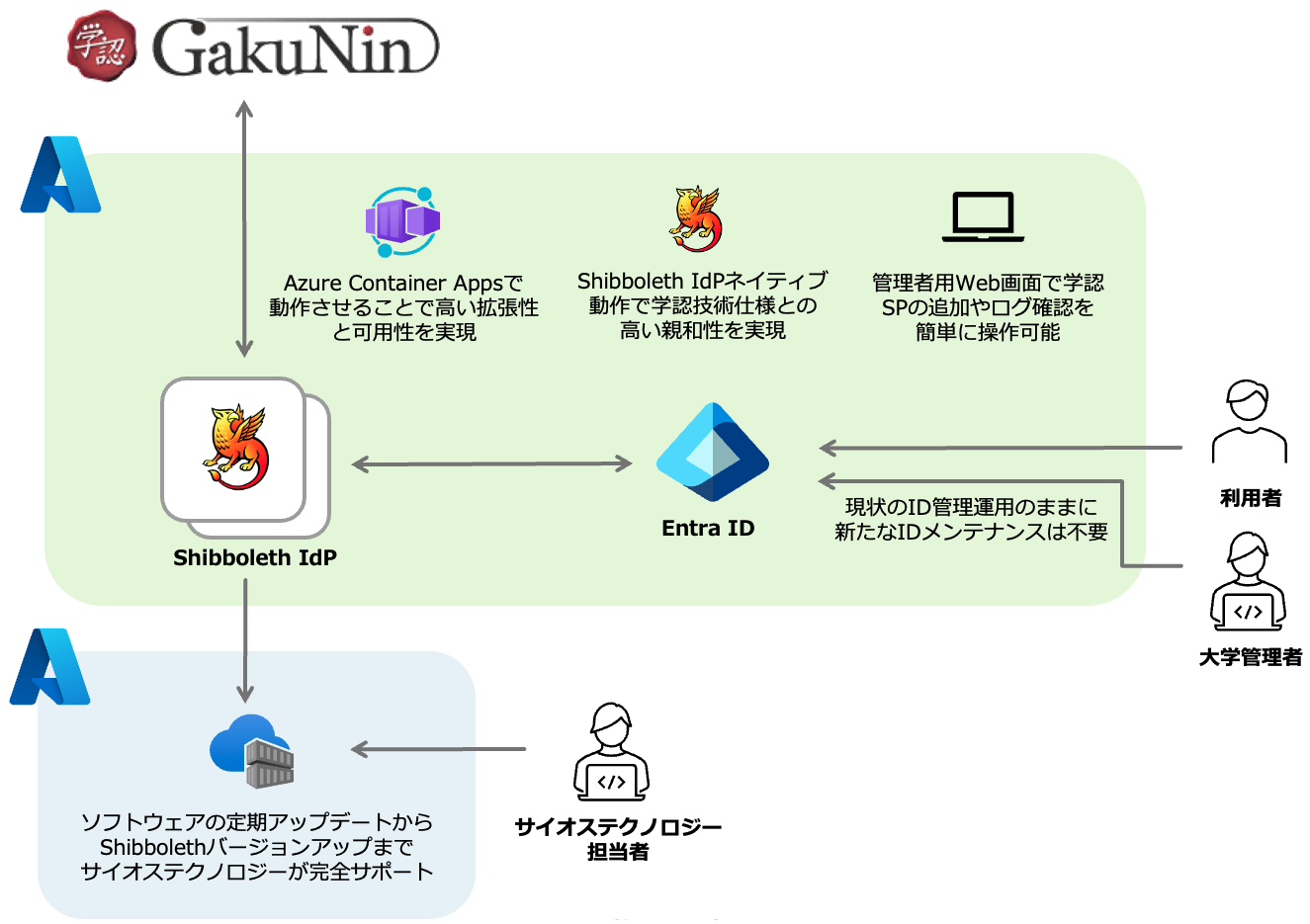 認証ソリューション「Shibobleth IdP」をコンテナ化し、お客様Azure基盤上にスムーズに導入できる環境を提供します。これにより、導入の初期コストを抑えながら、迅速かつ柔軟な運用を実現します。